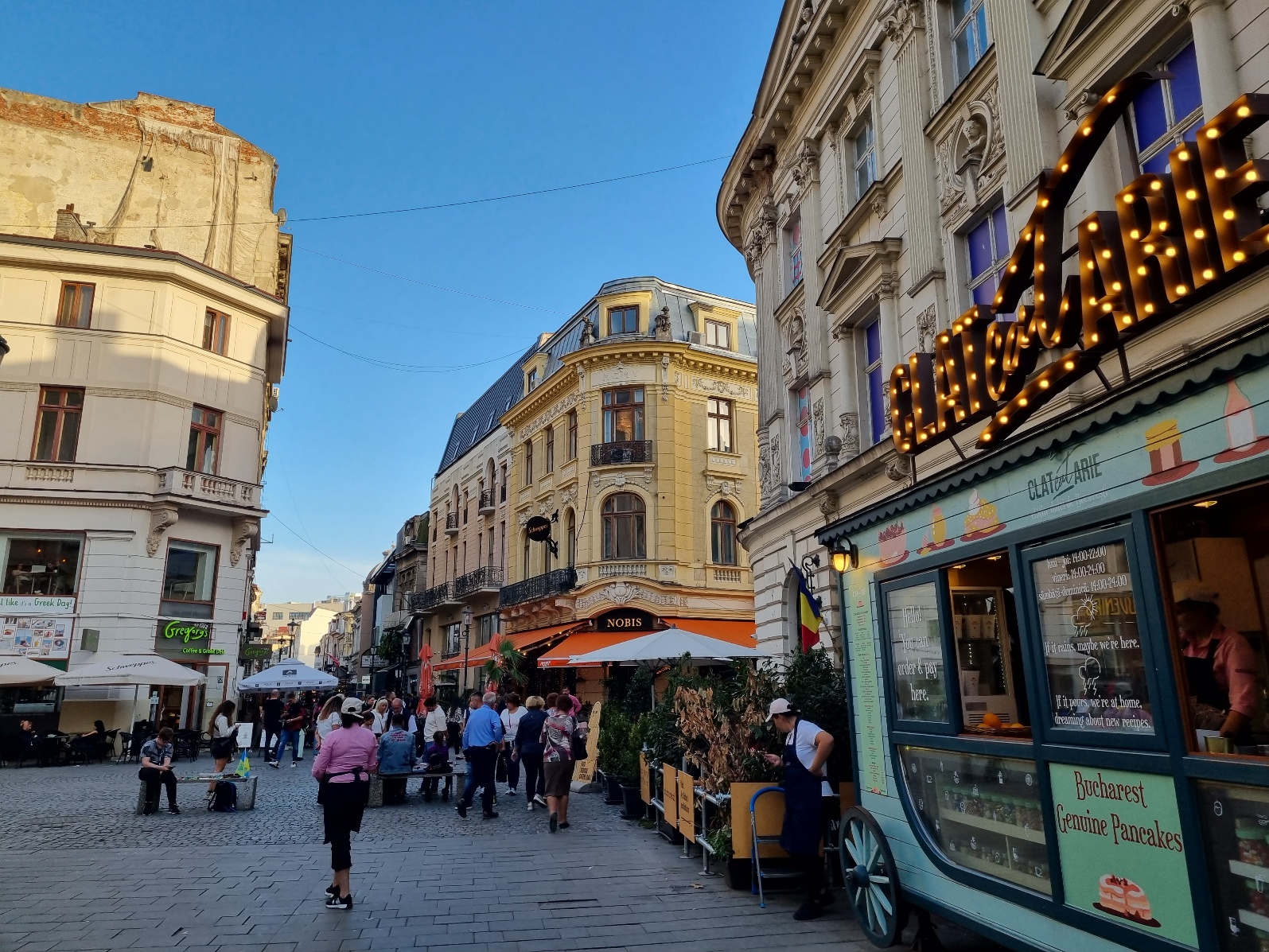 Tāpat jāpiemin kāda īpaša kafejnīca Bukarestē- te izstādītas Van Goga darbu reprodukcijas, un te sajūta, ka vienlaikus esi gan kafejnīcā, gan mākslas galerijā. Pilsētā ir gan dzīvīgas restorānu ielas, gan interesanti kokteiļbāri un kafejnīcas.