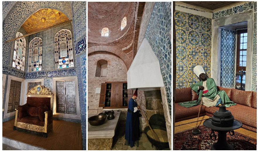 Pilī var aplūkot neskaitāmas uzņemšanas, sapulču, harēma telpas, guļamistabas, virtuvi, dārgumu glabātuvi, isllāma relikviju telpu. Telpu nosaukumi vien izraisa interesi - Melno galminieku mošeja, Melnā einuha dārgumu glabātāja dzīvoklis, Melno einuhu-sultāna sagaidītāju dzīvoklis, Četrdesmit kolonnu vieta, Džinu konsultāciju istaba. Kad skaistuma un informācijas par daudz, uzmeklējiet kādu no koridoriem, kuri izved kādā no daudzajiem ārā pagalmiem, un ieelpojiet dziļi - arī šeit jūtama ne tikai skaisto apstādījumu, bet arī vēstures smarža. Iesakām uzmeklēt pagalmu, kas harēma laikos bija paredzēts ekskluzīvi sultāna vistuvākajām favorītēm - no tā paveras lielisks skats uz Bosfora šaurumu. Vietējais gids parādīs arī Suleimana guļamistabu, kas viņa dzīves laikā atradās ārpus harēma, tāpat arī sultāna, sultāna mātes hamamu.