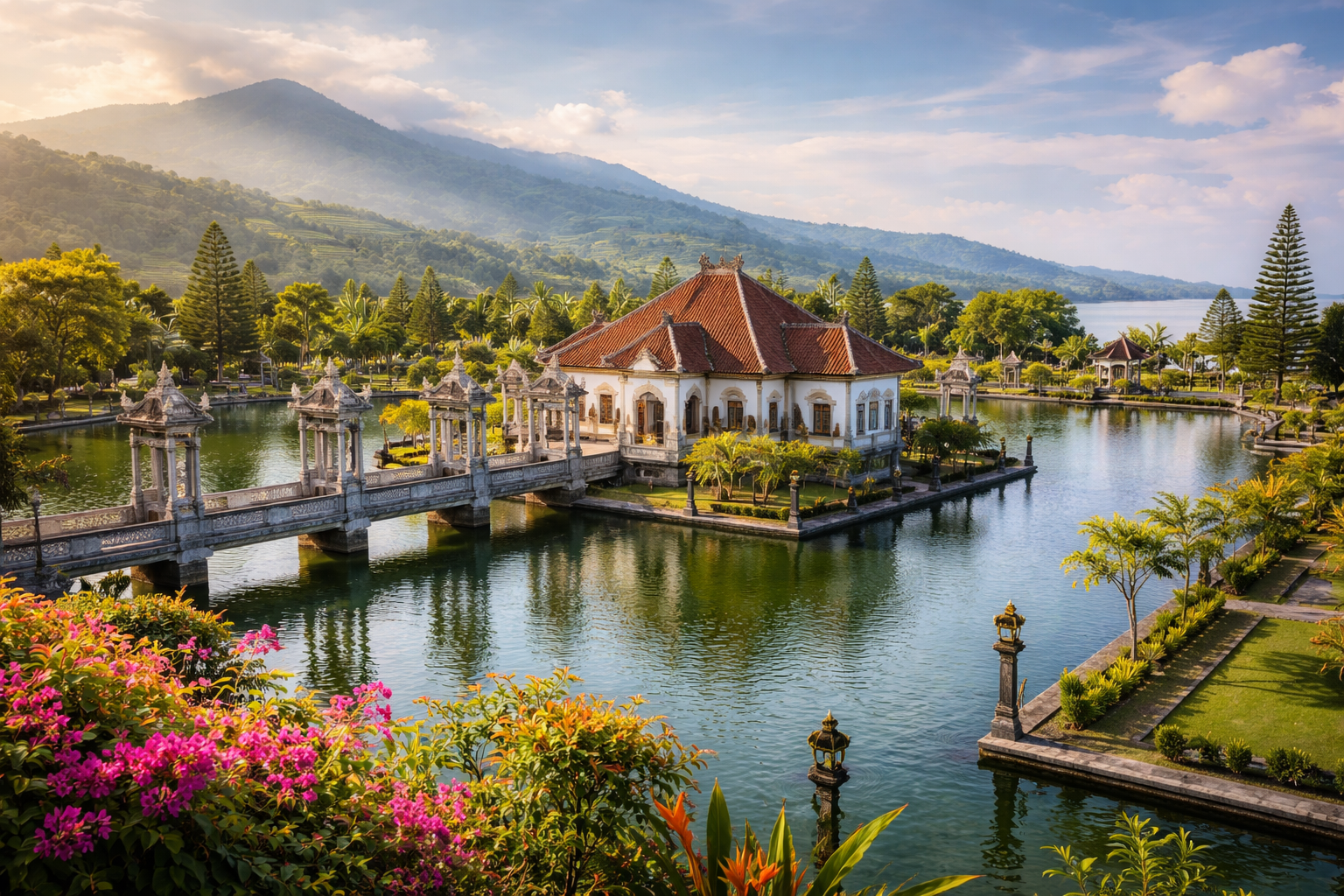 Šodien apmeklēsim Taman ujung sukasada jeb Ūdens pili. Tās nosaukums nozīmē "dārzs malā", kas iespējams saistīts ar trīs lielajiem ūdens baseiniem 12 hektāru lielajā pils teritorijā. Pils ēku arhitektūra ir Bali netipiska, piemēram, holandiešu koloniālā stila baltā fasāde un betona izmantošana, kas pils celtniecības laikā 20.gs.sākumā tika uzskatīta par jaunu tehnoloģiju un vēl vienu Rietumu ietekmes pazīmi. No pils kāpnēm rietumu pusē paveras burvīgs skats pāri visam dārzam uz kokosriekstu birzīm, Udžungas pludmali un tālāk esošo Lempujanas kalnu.
