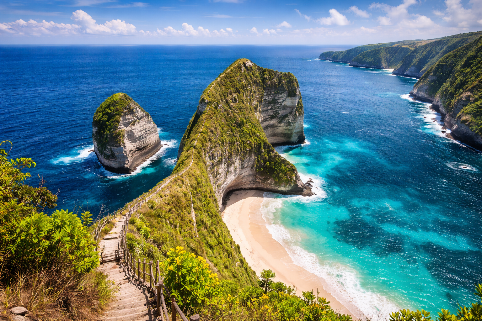 Dosimies pa stāvu taku, kas ved starp klintīm lejā līdz Kelingkingas pludmalei. Taka var būt diezgan izaicinoša, taču neapšaubāmi šī ir viena no gleznainākajām vietām Nusa Penidā un satriecošākā savvaļas pludmale Bali. Savu nosaukumu ieguvusi no savas unikālās topogrāfiskās formas. Vietējā valodā “Kelingking” nozīmē “mazais pirkstiņš”, taču apmeklētāji, skatoties uz to no skatu platformas, bieži vien redz tiranozaura veidolu.