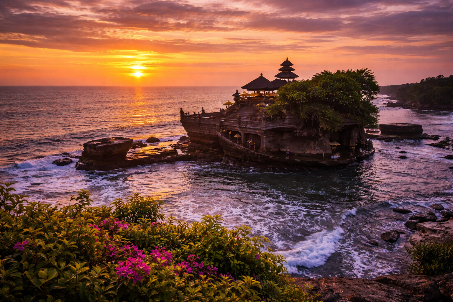 Saulrietu sagaidīsim Tanah Lot templī, kas ir viens galvenajiem baliešu jūras tempļiem. Nosaukums baliešu valodā nozīmē "zeme jūrā" . Tempļa galvenā dievība ir Deva Baruna jeb Bhatara Segara , jūras dievs vai jūras spēks. Tūristi bieži šo templi dēvē par “saulrietu templi.”