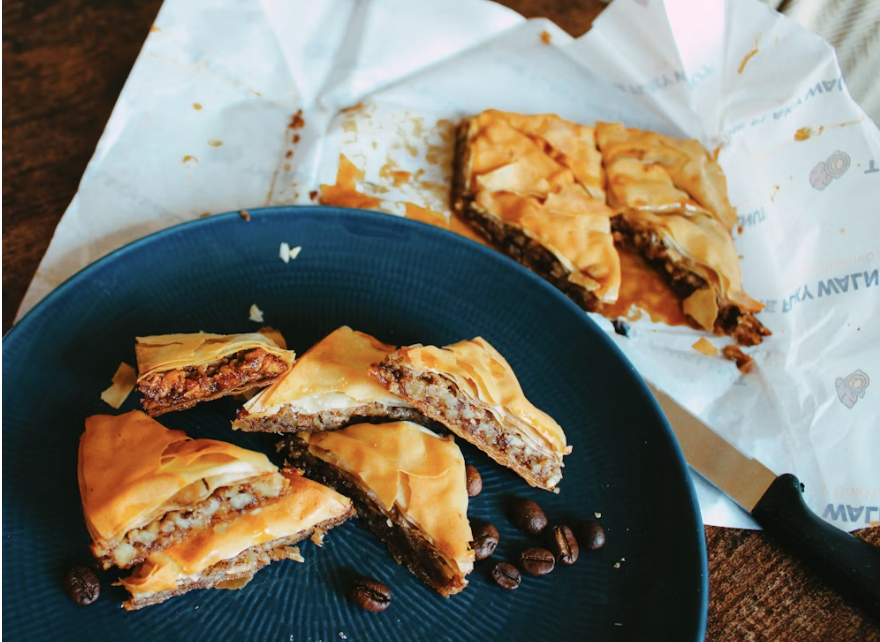 Kafejnīcu saldumu stendos meklējat xerotigana –tas ir kas attāli līdzīgs žagariņiem. Mīklu sagriež līdz pāris centimetru plānās plāksnītēs, dažkārt savirpina tādas kā saulītes. Tās fritē eļļā, kad gatavas- pārlej ar rožu, medus sīrupu, pārkaisa riekstiņiem. Šis ir senu laiku svētku ēdiens – kāzās, lieldienās, Ziemassvētkos. Mūsdienās tiek baudīts jebkad- mums te svētki ir ikdiena! Otrs deserts, kas jāpiedzīvo ir melekouni – sezama sēkliņas, mandeles un dažkārt arī citi rieksti, aplieti ar medus, kanēļa, kardamona, krustnagliņu sīrupu, dažkārt bergamotu, riekstus tādējādi salipinot. Šo desertu griež, lauž gabaliņos, bauda kā saldu uzkodiņu.