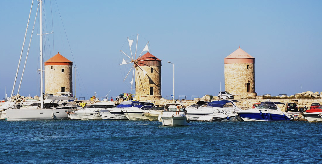 Vēl kāda vieta, kas jāpiedzīvo Rodas pilsētā, kaut no tāluma- fotogēniskās Rodas vējdzirnavas uz Mandraki mola. Senās kartes rāda, ka te jau 13.gadsimtā stāvējušas 18 vējdzirnavas, no kurām līdz mūsdienām saglabājušās trīs. Kāpēc vējdzirnavas atrodas tik tuvu ostai? Iemesls praktisks- te pieveda kviešus un miežus, tos uz vietas pie ostas samala un kā jau gatavu produktu ar lielāku tīrsvaru veda uz citām zemēm tirgot! Dzirnavas ražas laikā esot darbojušās bez apstājas, zemnieku pievesto graudu esot bijis tiešām daudz. 14. gadsimtā trīs dzirnavas iekļāva bruņinieku pilsētas teritorijā, līdz ar to tās saglabājušās arī šodien. Izmantošanas veidi šīm ēkām gan mainījušies- tās ne vien malušas graudus, bet tās kalpojušas arī kā pilsētas mūra aizsargposteņi. Šī ir vieta, kur dienas laiski pavada un Rodas mūrus nu sargā daudz kaķu, kas ir ļoti iemīļoti, Grieķijai tik ļoti piestāvoši dzīvnieki. Šī ir arī vieta, kur vērot, iespējams, salas skaistākos saulrietus!