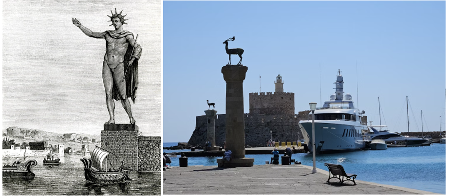 Kāda vieta, kas nu glabā vien nostāstus, atrodas Rodas ostā, pie izejas uz Egejas jūru. Vieta, kur mūsdienās katrā mola krastā stāv pa brieža statujai, reiz esot stāvējušas Saules Dieva Hēlija pēdas, un iebrukšana ostā simboliski esot notikusi vien ar viņa svētību. Rodas Koloss bija milzu statuja, iekļauta septiņu senās pasaules brīnumu sarakstā un, gadu tūkstošu laikā diemžēl zudusi. Statuju cēla no 292. līdz 280. gadam pirms mūsu ēras, to būvēja uz akmens un dzelzs konstrukcijas, klāja ar dārgām bronzas plāksnēm. Tās augstums esot bijis 32 metru, un tomēr- ir leģendas, ka koloss esot bijis tik liels, ka ostā varēja iekļūt vien, izbraucot starp Hēlija kājām. Ir vairāki iemesli un teorijas, kādēļ statujas pie ostas vairs nav- gan piektā gadsimta mūsu ēras zemestrīces, gan romiešu bēgšana no salas, līdzi ņemot visu, kas svēts un vērtīgs, gan statujas pārkausēšana arābu valdīšanas laikā. Tieši par arābu valdīšanu un Rodas kolosu ir šāds stāsts- viņi , atraduši dzelzi un bronzu, to pārkausējuši un pārdevuši. Lielāko metāla daļu esot nopircis kāds tirgotājs, kas nopircis tik daudz, ka metālu vajadzējis vest prom ar 900 kamieļiem.