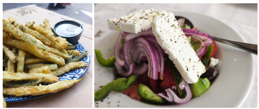 Noteikti ar maltīti jābauda grieķu jeb zemnieku salāti chloriatiki kā tos sauc grieķi paši. Vēl noteikti pasūtat tdzadziki– jogurta, gurķu un ķiploku mērcīti. Tā lieliski garšo arī ar panētām, fritētām cukini šķēlītēm!