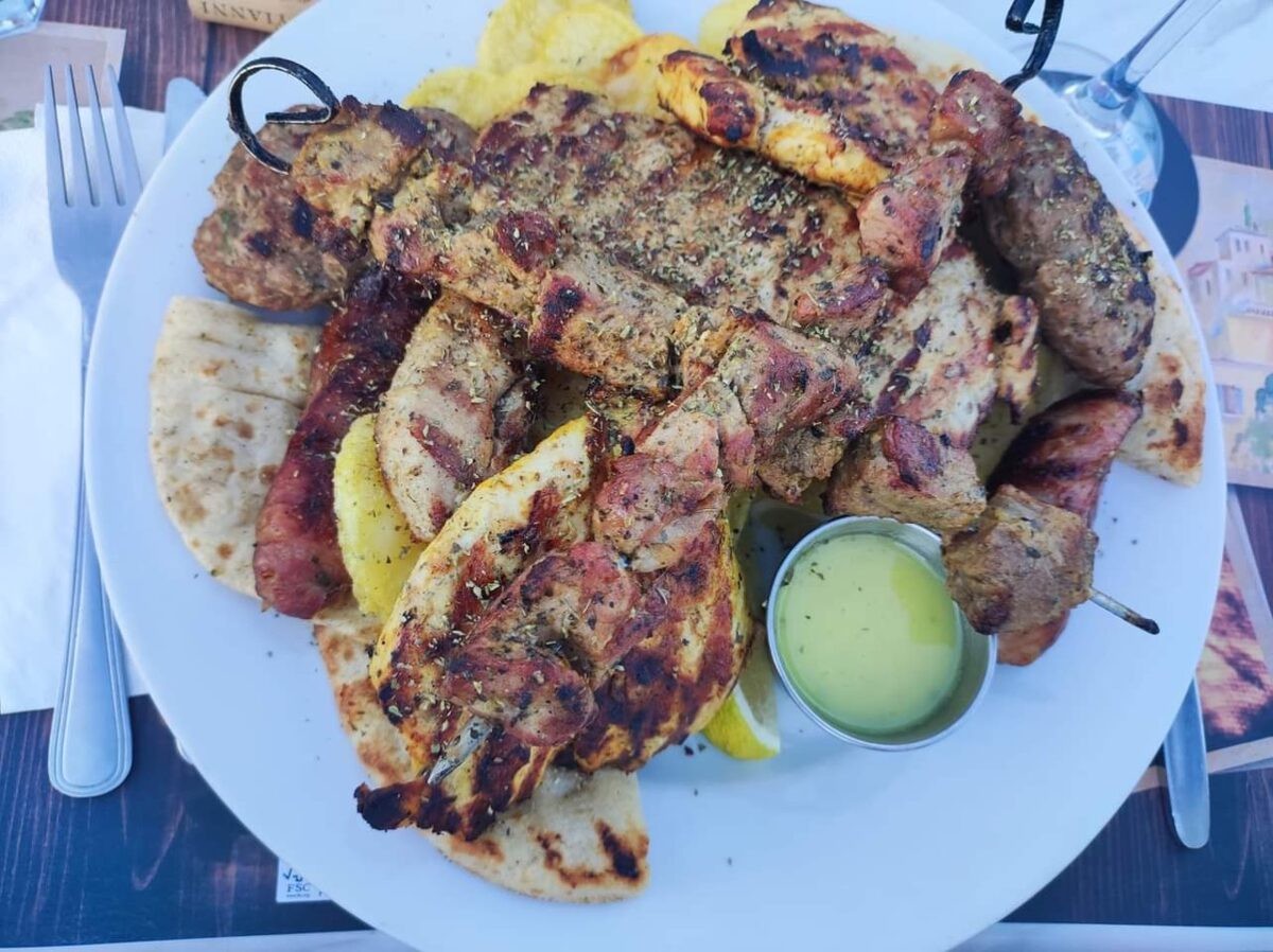 Pusdienās iesakām baudīt kādu tipisku grieķu ēdienu - souvlaki jeb girosu - uz iesma sadurtu, grilētu gaļu ar garšvielām. Vai soutzoukakia - gaļas bumbiņas, ko gatavo no liellopa, sīpoliem, garšvielām un pasniedz sutinātas tomātu mērcē. Tradicionālo ēdienu listē ir arī stifado - liellopa, tomātu un citu dārzeņu sautējums. Papoutsakia - ar malto gaļu pildīti baklažāni, dolmades jeb rīsu vai kāpostu lapu rullīši, pildīti ar rīsiem, dažkārt ar gaļu, un garšvielām. Klāt tzadziki gurķu, ķiploku un krējuma mērce, un esam nonākuši grieķu paradīzē! Te gan brīdinām izvērtēt savas vēlmes un nepasūtīt visus šos ēdienus vienlaikus - katrs no tiem ir atsevišķa maltīte, kas dos sāta sajūtu uz ilgu laiku.