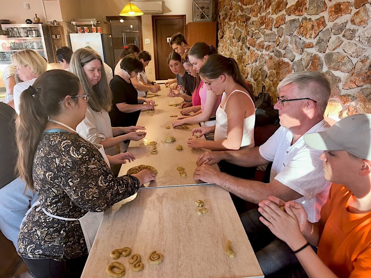 Namamāte ar meitu piedāvās mums arī ēst gatavošanas meistarklasi: uzzināsim, kādus saldumus gatavo katra sevis cienoša grieķu vecmāmiņa, “ja ledusskapī nekā nav”: cepsim apelsīnu cepumus un īpašās grieķu pankūkas- un šo visu, no viņu pašu bioloģiskajām izejvielām! Saimnieki smej, ka vien sāls nav pašu, viss cits gan- milti, apelsīni, citroni, olīveļļa. Uzrotīsim rokas un veidosim cepumu formiņas, liksim tās uz pannas un gaidīsim telpā izplešamies saldu cepumu smaržu!