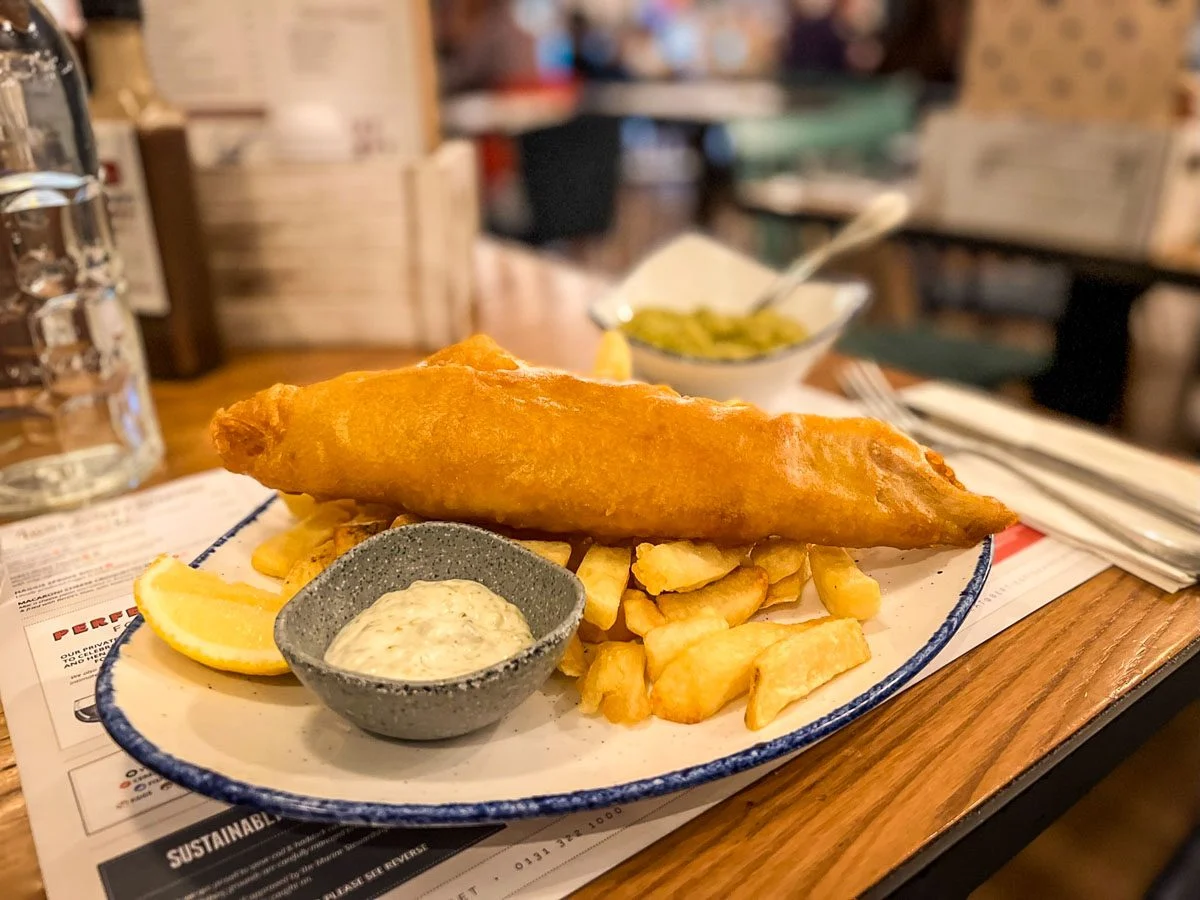 Tradicionālais FISH & CHIP. Jā, kartupeļi ar fritētu zivi ir Skotijas nacionālais ēdiens.
